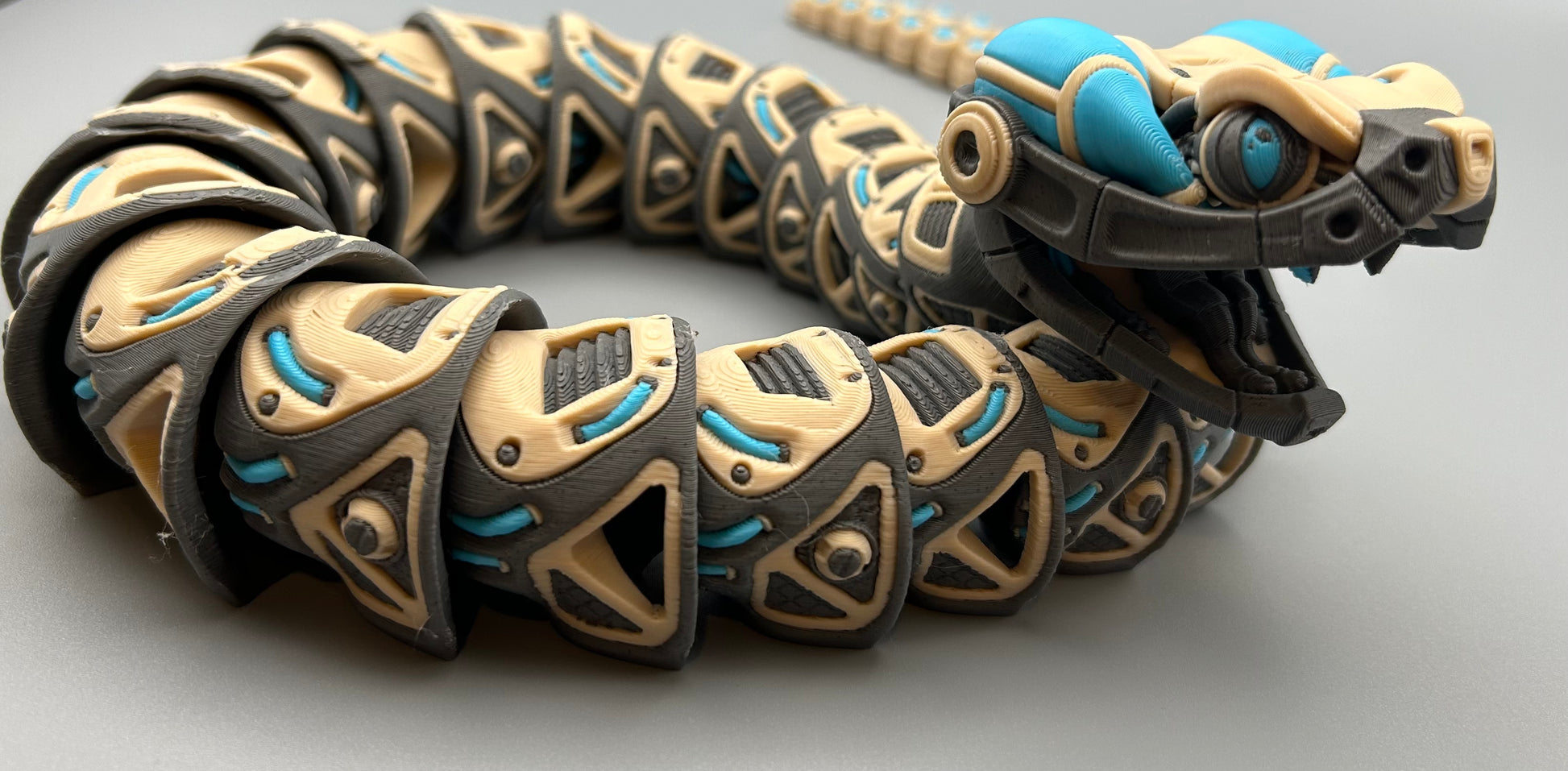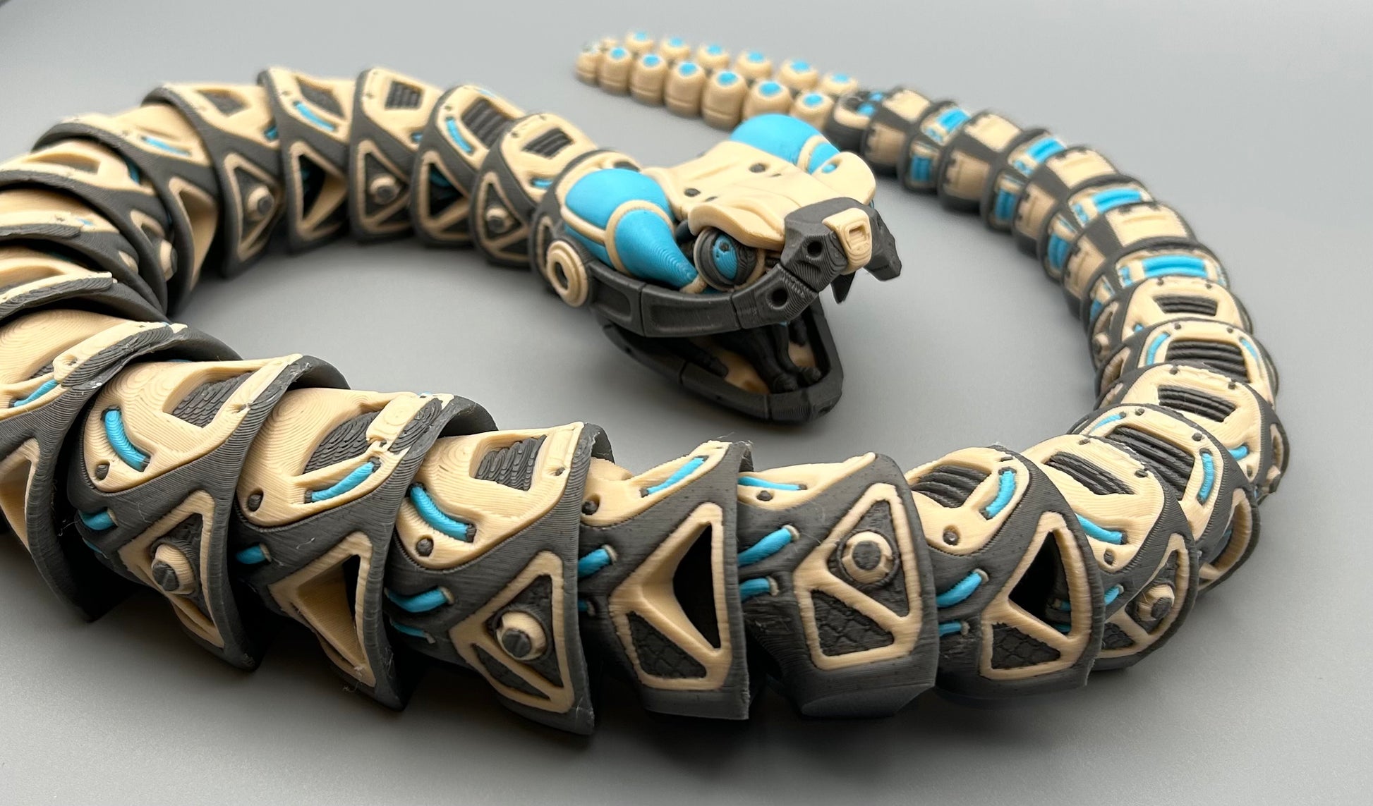 This articulated robotic rattlesnake figure is packed with attitude and ready to slither into action. With jointed segments that let it coil, wiggle, and strike a pose like a true reptilian runway model, it’s got more moves than your last dance party. And don’t forget that legendary rattle — give it a shake and it lets loose with a satisfying ch-ch-chika-chika, like a maraca that’s had too much coffee.